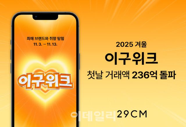 이날 29CM에 따르면 이번 이구위크는 지난 3일 오후 7시 시작해 5시간 만에 거래액 100억원을 넘겼고, 24시간 기준 누적 236억원을 기록했다. 지난해 겨울 행사 대비 약 27% 증가한 수치다. 행사 개시 직후 트래픽이 급증하며 일 방문자 수도 전주 대비 두 배 이상 늘었다.