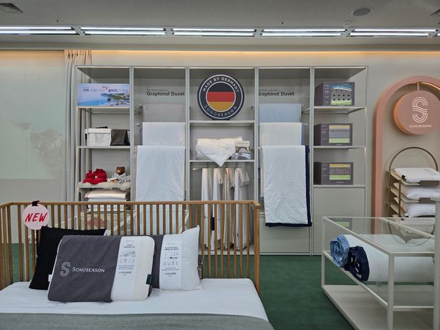 소노시즌은 대표 제품인 100% 독일산 메모리폼 매트리스와 프레임, 침구류 등 숙면 관련 제품을 함께 선보인다. 특히 소노시즌 메모리폼 매트리스는 업계 최초로 완제품 전 품목 TUV 라인란드 인증을 획득했으며, 한일원자력 시험분석센터에서 라돈 검출 테스트를 완료해 국내 권고 기준 이하로 생산된다. 매장에서는 1대 1 맞춤 구매 상담도 제공한다.