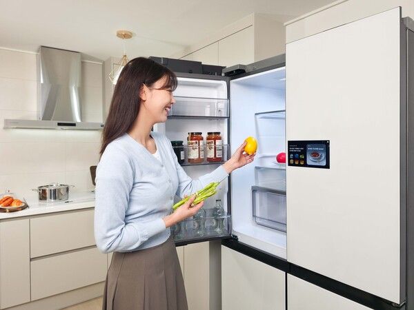 삼성전자 모델이 냉장고에 들어오고 나가는 식재료를 인식해 자동으로 푸드 리스트를 생성하는 'AI 비전 인사이드(AI Vision Inside)'를 체험하고 있다.
