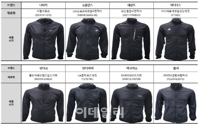 해당 제품은 △나이키(리펠마일러) △뉴발란스(UNI스포츠에센셜바람막이) △데상트(러닝웜업바람막이) △아디다스(아디제로에센셜러닝재킷) △안다르(클리어페더맨즈윈드자켓) △언더아머(UA론치후드재킷) △젝시믹스(RX에어라이트자켓) △휠라(PERTEX경량바람막이)다.