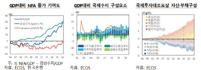 순대외자산은 경상수지와 자산가격·환율 변화에 의해 조정되는데, 과거에는 자산가격이 상승하면 외국인 투자금이 늘어나 부채가 빠르게 증가하면서 순대외자산이 줄어들었다. 하지만 2020년대 이후로는 해외주식 비중이 확대되고 미국 증시 강세로 인해 순대외자산이 쉽게 줄어들지 않는 구조로 바뀌었다.