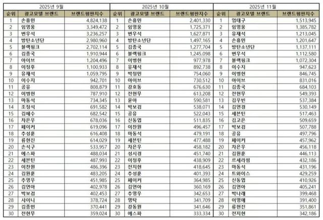 2025년 11월 광고모델 브랜드평판 30위 순위는 엄태구, 임영웅, 유재석, 손흥민, 방탄소년단, 변우석, 블랙핑크, 이수지, 이병헌, 아이브, 김종국, 전현무, 김우빈, 김연경, 세븐틴, 김고은, 박보검, 공유, 페이커, 차은우, 김원훈, 르세라핌, 마동석, 트와이스, 신동엽, 김연아, 박나래, 이영애, 류현진, 전지현 순이었다.