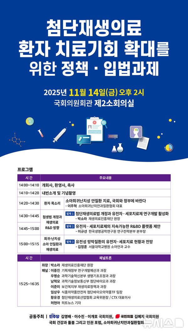 첨단재생의료 치료 기회를 기다리는 희귀난치질환 환자들의 목소리를 직접 듣고, 정부와 국회, 산업계가 함께 실질적인 해법을 모색하는 자리가 마련된다.