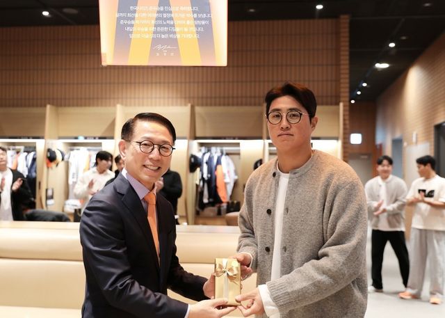박종태 한화이글스 대표(왼쪽)가 한화이글스 주장 채은성에게 김승연 한화그룹 회장의 선물을 전달하고 있다. / 한화그룹 제공