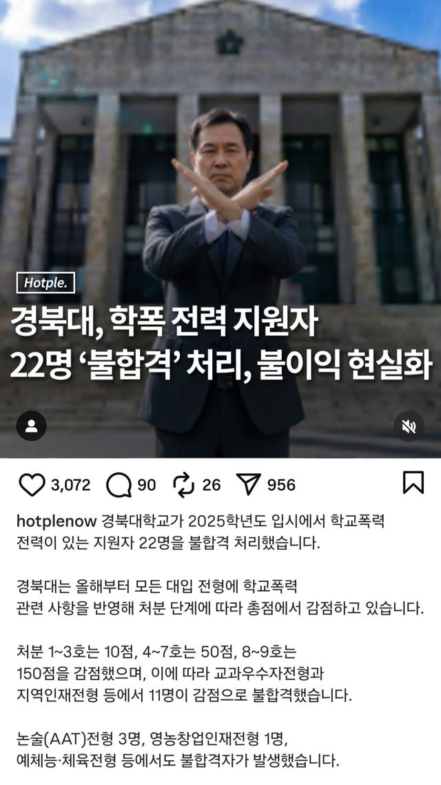 경북대 학폭 전력 지원자 22명 불합격 처리