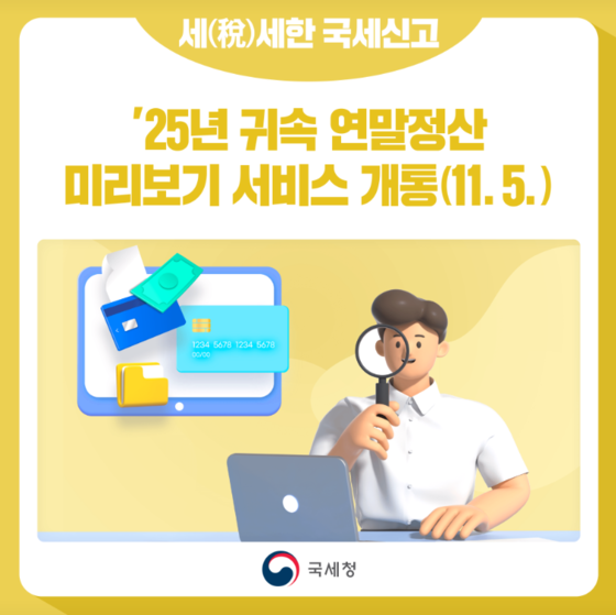 연말정산 미리보기에서는 지난 1∼9월 신용·체크카드 등 사용액과 지난 연말정산 때 신고한 공제 금액을 이용해 내년 1월 연말정산 예상세액을 계산해 보고 연말 소비·저축 계획도 세울 수 있다.
