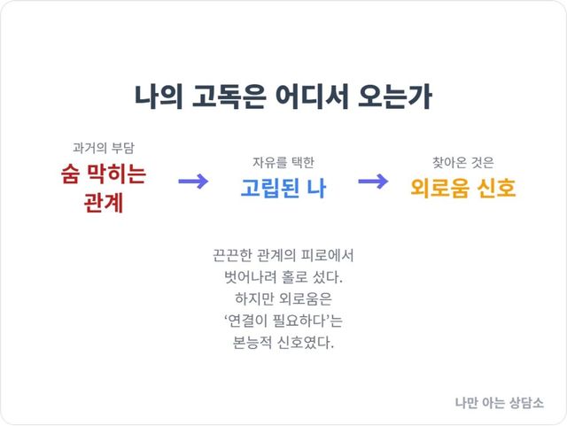 이 신호를 계속 무시하면, 우리의 정신 건강은 만성적인 스트레스 상태에 놓이게 됩니다. 우리는 자유를 원하지만, 동시에 연결되고 싶은 존재인 것입니다.