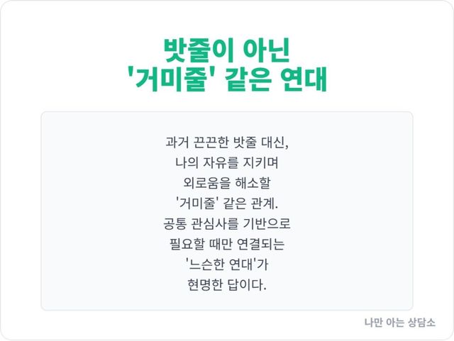 이는 개인의 자유와 경계선을 존중하면서도, 고립의 감정은 해소하고 따뜻한 소속감을 느낄 수 있게 해주는, 현대인을 위한 가장 현명한 관계의 형태입니다.