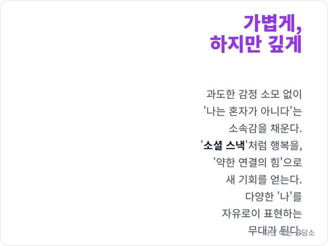 - - 가성비 높은 정서적 충족: 느슨한 연대는 과도한 감정 노동을 요구하지 않으면서도 ‘나는 혼자가 아니다’, ‘나는 이 집단의 일원이다’라는 소속감을 줍니다. 이는 외로움을 해소하는 데 매우 효율적입니다.