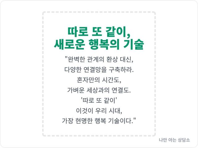 혼자만의 시간을 만끽하되, 기꺼이 세상과 가볍게 연결될 준비. 그것이 바로 ‘따로 또 같이’를 추구하는 우리 시대의 새로운 풍경이자, 가장 현명한 행복의 기술입니다.