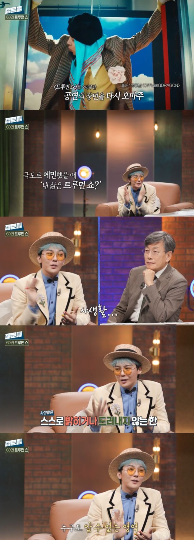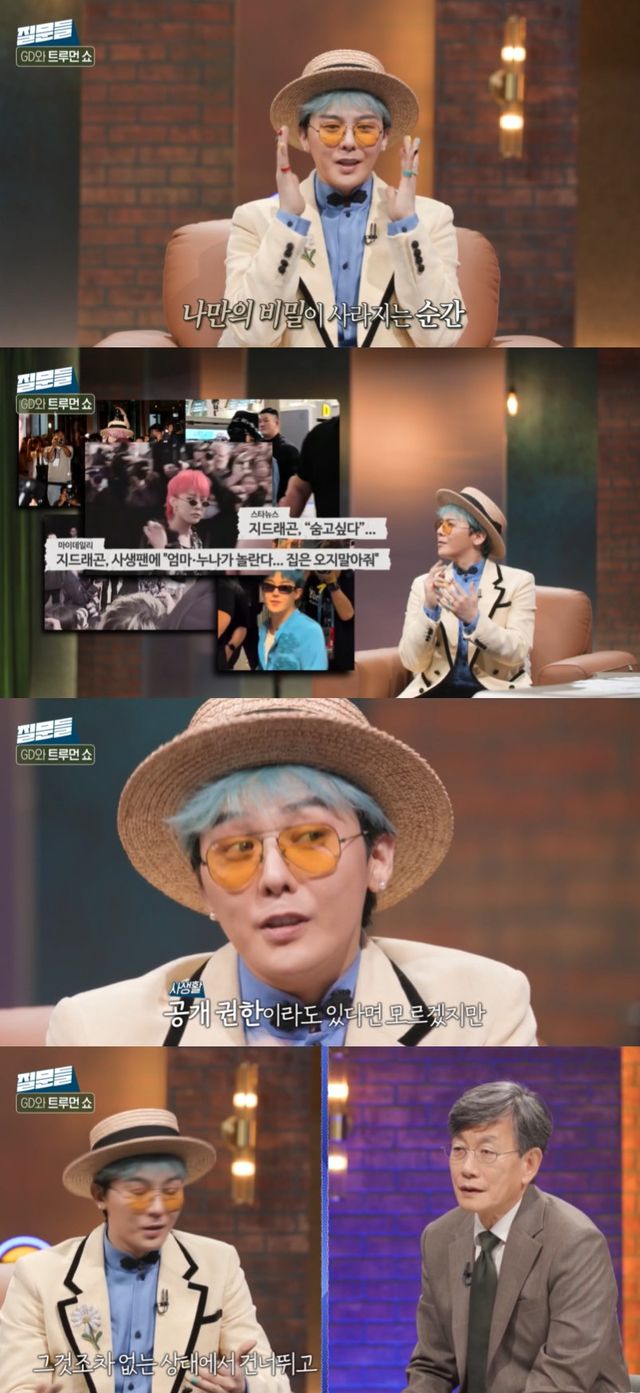 이에 지드래곤은 "연결고리가 많다고 생각한다. 극도로 예민했을 때 (내 인생이) '트루먼 쇼'라고 생각한 적 있다"며 "말이 안 되는 일이 반복적으로 일어났다. 모든 환경에 사실 대놓고 카메라가 있다"고 이야기했다.