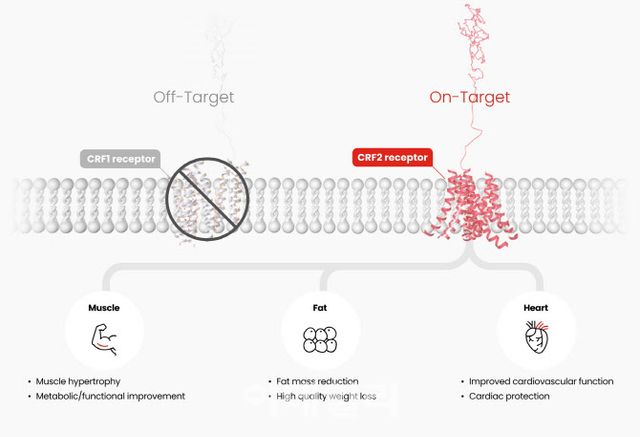 CRF family는 스트레스 반응 및 스트레스 회복과 관련된 신호 분자로, 그 수용체 중 CRF2 수용체를 선택적으로 타깃하면 지방 감소와 근육 증가, 근 기능 개선 등을 직접 이끌어낼 수 있다는 게 한미약품 설명이다.