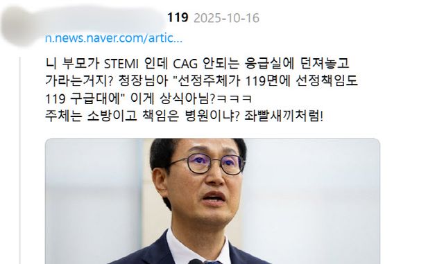 사용자는 김승룡 직대 사진과 함께 “니 부모가 STEMI(급성심근경색)인데 CAG(관상동맥조영술) 안 되는 응급실에 던져놓고 가라는데? 청장님아 ‘선정 주체가 119면에 선정 책임도 119구급대에’ 이게 상식이냐? ㅋㅋㅋ 주체는 소방이고 책임은 병원? 좌빨 XX처럼!”이라고 썼다.