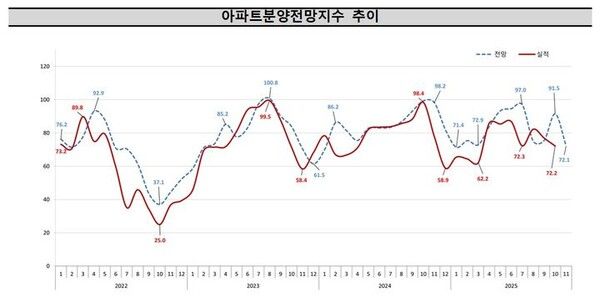 뉴시스 보도에 따르면, 6일 주택산업연구원이 주택사업자를 대상으로 설문 조사한 결과, 11월 아파트 분양전망지수는 전국 평균 19.4포인트(p) 하락한 72.1로 나타났다.