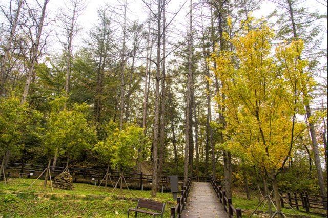 유아숲 체험원을 지나면 본격적인 숲길이다. 완만한 나무데크길 양옆에는 울창한 나무가 줄지어 서 있다. 북쪽 지역이라 그런지 가을빛이 더 빠르고 짙게 물든다. 좌우로 굽은 오르막 데크길은 1km 지점쯤에서 내리막으로 바뀌고, 700여 미터 정도 아기자기한 데크길이 더 이어진다. 걷다보면 종종 나무에 묶어 둔 ‘잘 될 거야’ 혹은 ‘잘하고 있어’와 같은 문구들이 눈에 들어온다. 숲을 걷는 동안 작은 위로가 되어주는 말들이다. 그렇게 숲길을 한 바퀴 돌고 나면 마음이 한결 따뜻해지고, 다시 일상으로 돌아갈 힘이 생긴다.