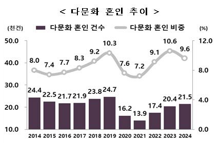 6일 국가데이터처가 발표한 ‘2024년 다문화 인구동태 통계’에 따르면, 지난해 다문화 혼인은 2만 1450건으로 1년 전보다 1019건(5.0%) 증가한 것으로 집계됐다. 다만 전체 혼인(22만 2000건)에서 다문화 혼인이 차지하는 비중은 9.6%로 전년보다 1.0%포인트 감소했다. 이 비중은 2019년(10.3%) 이후 4년 만인 2023년 10%를 돌파한 뒤 소폭 줄었다.