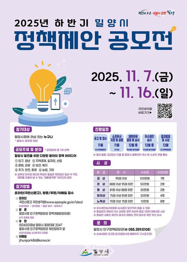 6일 밀양시는 오는 7일부터 16일까지 ‘2025년 하반기 정책제안 공모전’을 진행한다고 밝혔다.