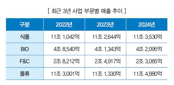 2022년부터 2024년까지 최근 3년간 사업 부문별 매출 변화를 보면 식품과 물류사업은 증가했지만, BIO와 F&C 사업은 줄었다.