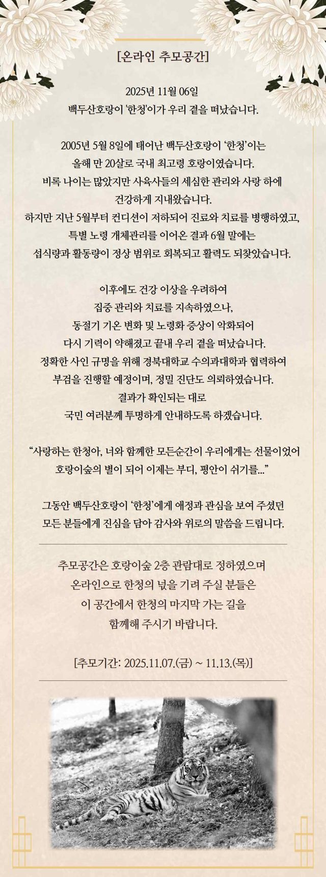 국내 최고령 백두산 호랑이 ‘한청’이 스무 살의 나이로 생을 마감했다.