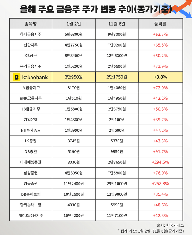 같은 기간 KB금융과 신한지주, 하나금융지주 등 대부분의 은행주들이 모두 두 자릿수에 달하는 상승률을 보였다. 올해 초 대비 주가가 가장 많이 오른 종목은 우리금융지주로 73.9% 상승했다. 이어 ▲iM금융지주(72.0%) ▲신한지주(+65.8%) ▲하나금융지주(+63.7%) ▲JB금융지주(+50.3%) ▲KB금융(50.2%) ▲BNK금융지주(+42.2%) ▲기업은행(+39.7%) 등의 순이었다. 가장 상승폭이 적었던 기업은행만 놓고 보더라도 카·뱅 주가 상승률과는 무려 35%p 가량 차이가 난다.