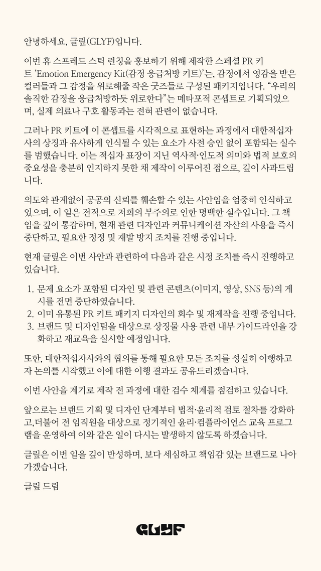 6일 글맆 공식 SNS에는 “이번 휴 스프레드 스틱 런칭을 홍보하기 위해 제작한 스페셜 PR 키트 ‘감정 응급처방 키트’를 시각적으로 표현하는 과정에서 대한적십자사의 상징과 유사하게 인식될 수 있는 요소가 포함되는 실수를 범했다”고 말했다.