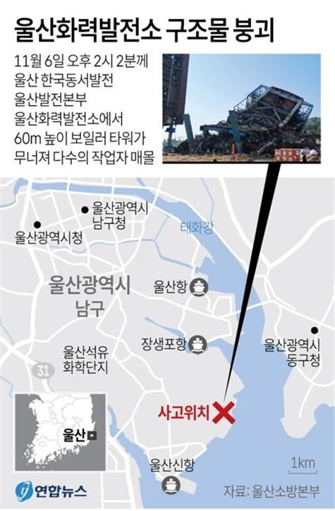 한국동서발전 울산화력발전소에서 철골 구조물이 붕괴해 보일러 타워를 철거하던 작업자 9명이 매몰됐다. 이날 오후 7시 기준 매몰됐던 작업자 2명이 구조됐으며, 7명은 여전히 매몰된 상태인 것으로 알려졌다.
