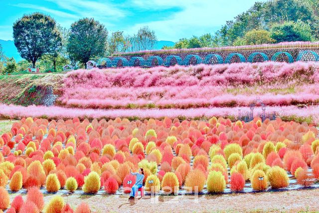 이곳의 매력은 색깔에 있다. 핑크뮬리의 분홍빛, 코키아의 붉은빛과 노란빛, 그리고 멀리 이어지는 지리산의 푸른 능선이 하나의 화폭을 이룬다. 마을 안쪽에는 포토존과 작은 조형물이 마련돼 있다. 흰색 마차 모양의 벤치, 유리문 프레임, 나무 아치가 자연스럽게 어우러진다. 관광객들은 계절의 풍경 속에 자신을 넣고 한 장의 사진을 완성한다.