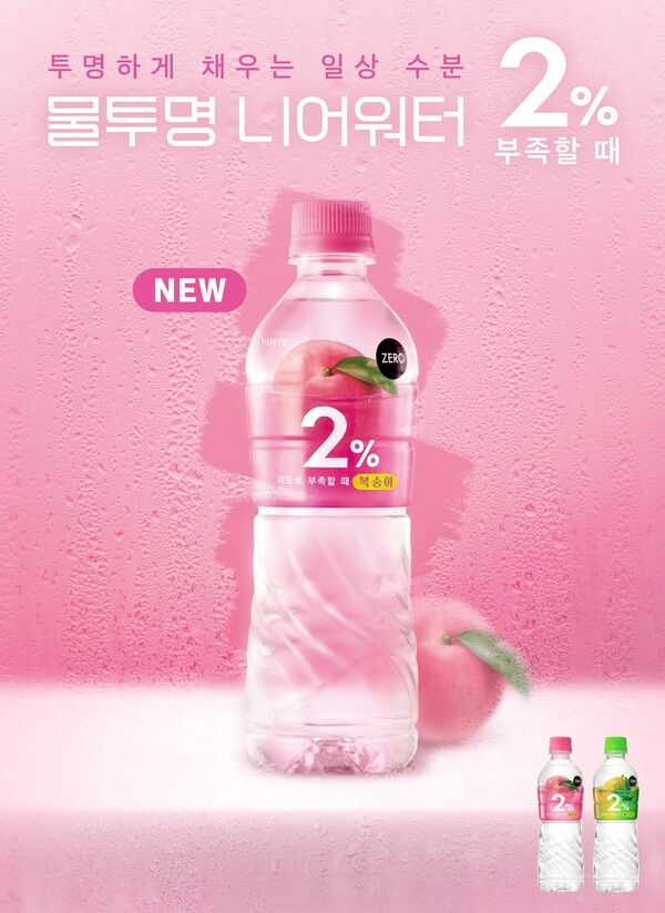 한편, 롯데칠성음료는 지난 9월 제로 칼로리로 리뉴얼된 ‘2% 부족할 때 복숭아’를 출시했다. 과일 색상을 입힌 라벨과 용기 하단 물결무늬를 적용한 신규 페트병을 도입했으며, 제로 칼로리로 언제 어디서나 칼로리 부담 없이 수분 충전을 할 수 있도록 했다. 또한 일상 속 활력이 필요한 소비자를 겨냥해 아르기닌 1000mg과 비타민 B군이 함유된 신제품 ‘2% 부족할 때 바이탈 레몬라임’도 출시해 니어워터 시장 활성화를 주도하고 있다.