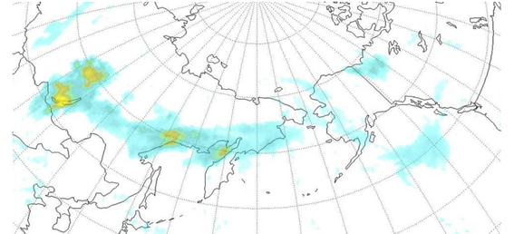 ▲ 2019년 여름 한 달 이상 지속된 시베리아 산불로 인한 에어로졸의 이동 현황. 그림은 시베리아 서부와 중부 및 동부에서 동시다발적으로 발생한 산불