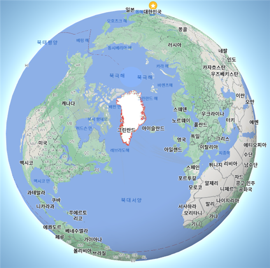 ▲ 북극해 북극 지역(파란색 원)에 가까이 붙은 그린란드(흰색)의 지구의(地球儀)에서의 위치. 현재는 남극대륙에 이어 두 번째로 큰 빙상으로 덮여 있는 ‘얼음의 땅’이지만 200만 년 전에는 코끼리의 일종인 마스토돈과 토끼 등이 번성하던 숲 지대였던 것으로 조사 연구되었
