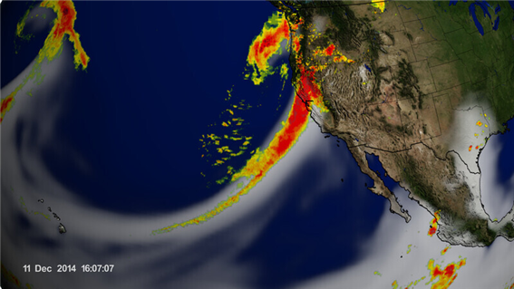 ▲ 지난 2014년 11월 북태평양 일대에 나타난 ‘대기의 강’. 북미대륙 북쪽 알래스카 알류산열도 부근에서부터 남쪽으로 하와이제도를 거쳐 다시 동북쪽 미국 캘리포니아주까지 활처럼 휘어 있다. 그 길이는 1만㎞ 가까이 될 정도로 매우 길다.