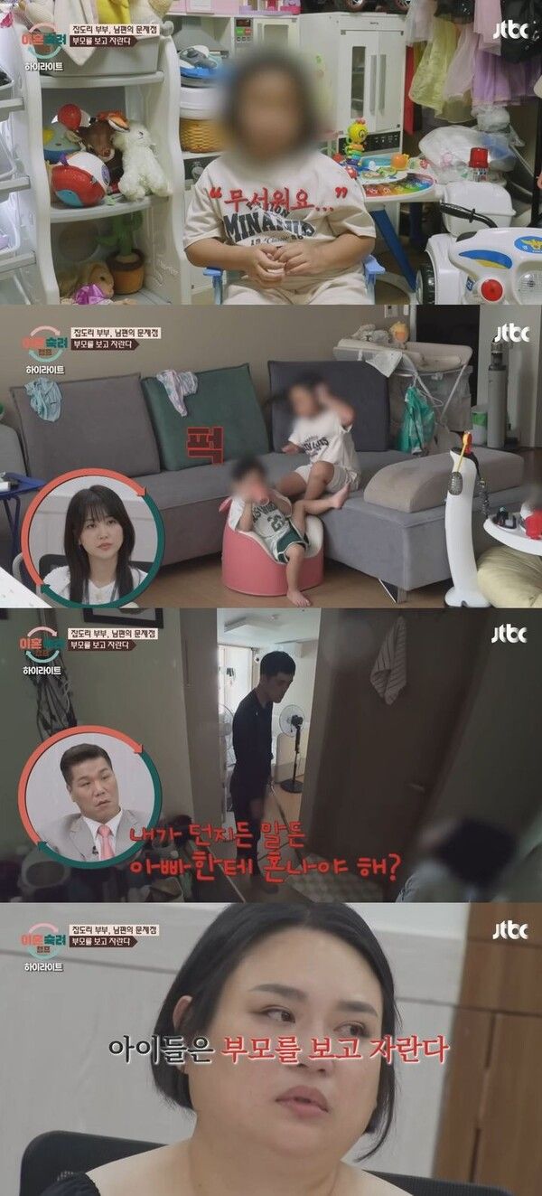 이어진 영상에서 첫째 딸은 남동생이 음료를 주지 않자 때리기 시작했다. 이를 본 남편이 화를 내자 딸은 물건을 던졌다.