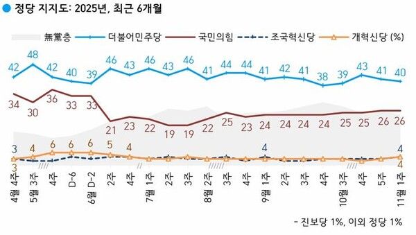 한국갤럽이 지난 4~6일(11월 첫째 주) 전국 만 18세 이상 유권자 1002명을 대상으로 정당 지지도를 조사한 결과 민주당은 40%, 국민의힘은 26%로 집계됐다.