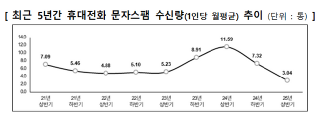 특히 휴대전화 문자스팸(3.04통)은 최근 5년 내 최저 수치를 기록했다. 휴대전화 문자·음성스팸 신고·탐지량(총 3779만건)도 최근 2년 내 최저치다.