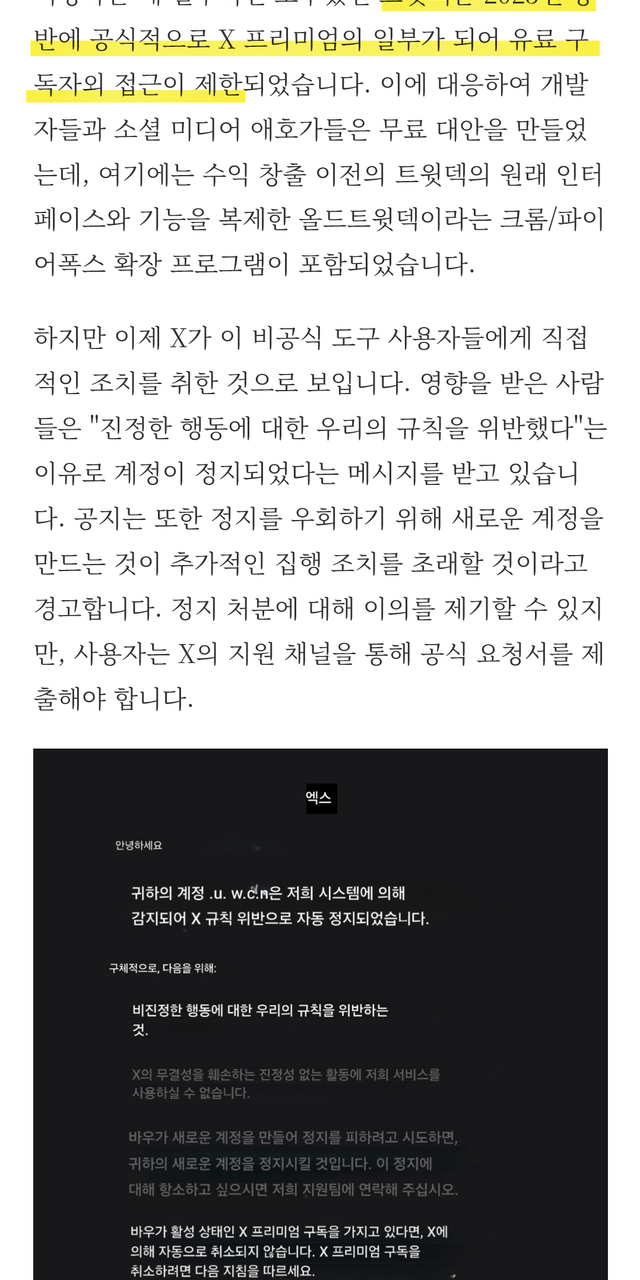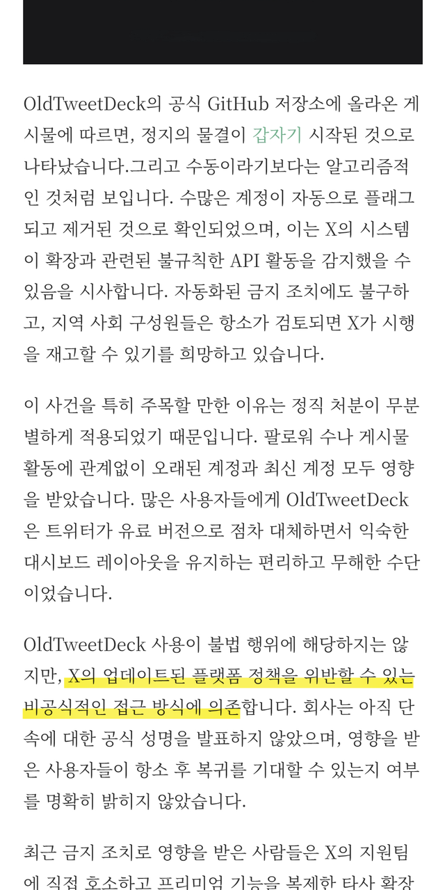6. X의 자동화 시스템이 올드트윗덱 사용자들을 "비정상적 행위 금지 규칙위반"을 이유로 대규모 일시정지 처리함