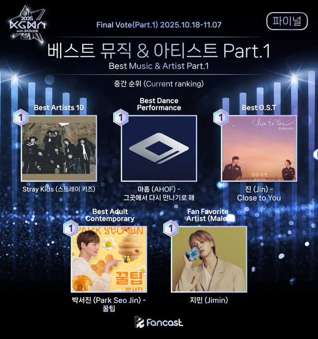 ‘2025 코리아 그랜드 뮤직 어워즈(KGMA)’의 각 부문 파이널 투표가 종료 임박한 가운데 중간 순위가 공개됐다.