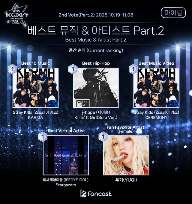 오는 8일 종료되는 ‘베스트 뮤직& 아티스트 부문(PART 2)’ 파이널 투표의 ‘베스트 뮤직 10’은 스트레이 키즈의 ‘카르마’가 2위 마크의 ‘더 퍼스트푸르트’를 앞서고 있고, ‘베스트 힙합’은 제이홉의 ‘킬링 잇 걸’과 지드래곤의 ‘홈 스위트 홈’이 근소한 차이로 1위와 2위를 다투고 있다.