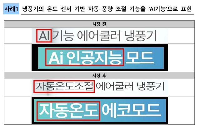 대표적으로 온도 센서 기반 냉풍기의 자동 풍량 조절 기능을 'AI 냉방'으로 표시한 사례는 '자동 온도 조절'로 수정됐고, 제습기의 습도 센서 기능을 '인공지능 제습'으로 광고한 건은 문구가 삭제됐다.