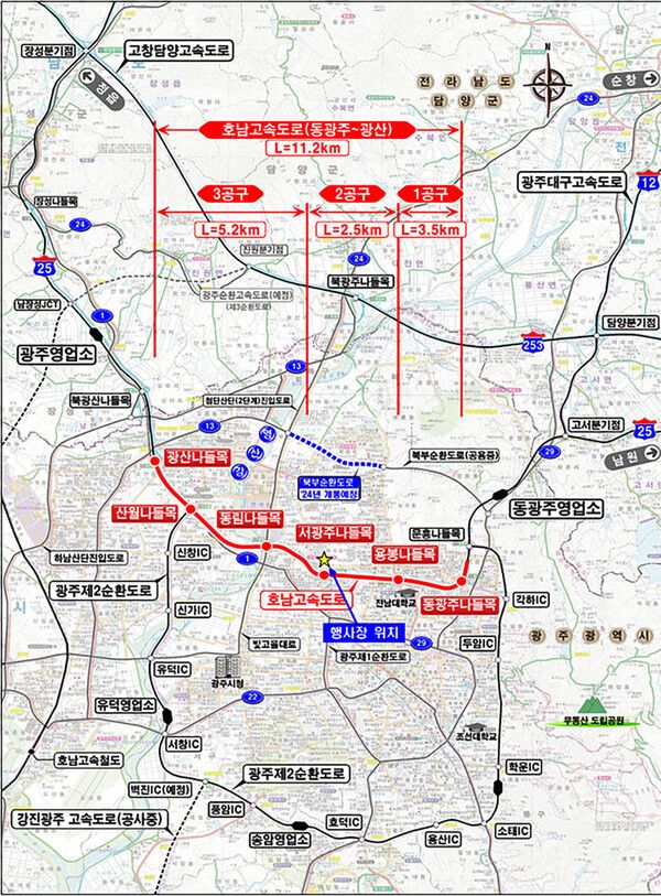 이어 "국가 물류 흐름에 직접적 영향을 미치는 구간임에도 불구하고 사업의 재정 분담 구조가 중앙정부 20%, 한국도로공사 30%, 광주광역시 50%로 되어 있어 지방정부의 부담이 지나치게 크다"며 재벙분담 비율 조정을 요구했다.