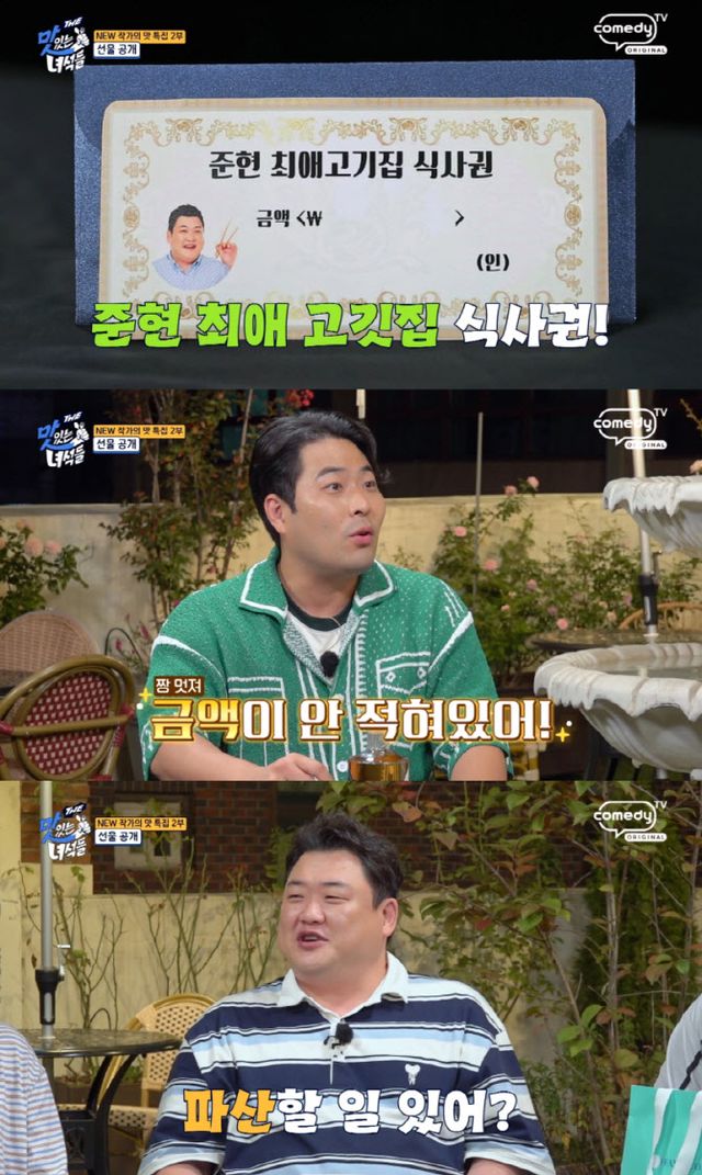 이날 가장 시선을 끈 건 김준현이 준비한 최애 고깃집 식사권으로 이를 본 김해준은 “준현이 형이 진짜 멋있다고 생각한 게, 금액이 안 써 있다. 백지 식사권이다!”라며 감탄한다. 하지만 김준현은 “볼펜이 여기 있지. 무슨 짓을 할 줄 알고 내가 백지수표를”이라며 재치 있게 받아쳐 폭소를 안긴다. 이어 혹시라도 ‘300만 원’이라고 적을까 봐 몇 번이고 금액을 확인하는 모습으로 또 한 번 웃음을 자아낸다.