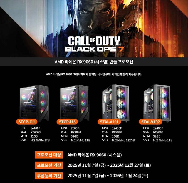STCOM은 XFX 라데온 RX 9060 그래픽카드가 포함된 조립 PC 4종 구매 고객을 대상으로 콜 오브 듀티: 블랙옵스7 게임 번들 증정 행사를 진행한다. RDNA 3 아키텍처 기반의 라데온 RX 9060은 1080p 해상도 환경에서 향상된 게이밍 성능과 FSR 4 기술을 지원하며, 행사 대상 제품 구매 후 QR 코드 신청을 통해 번들 코드를 수령할 수 있다.