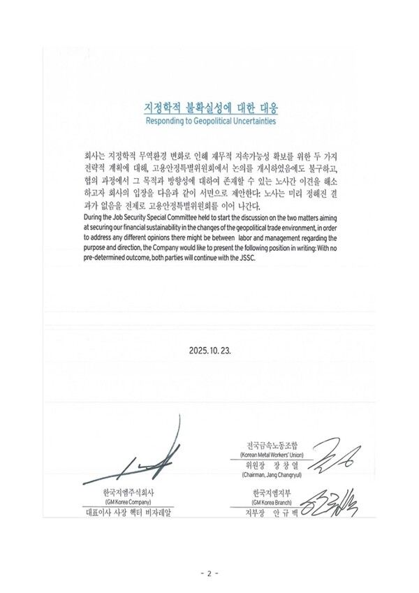 7일 전국금속노조 한국지엠지부 정비부품지회에 따르면, 노사는 2025년 임금교섭 과정에서 "직영 정비소 관련 사안은 미리 정해진 결과 없이 고용안정특별위원회를 통해 논의한다"는 내용에 합의했다.