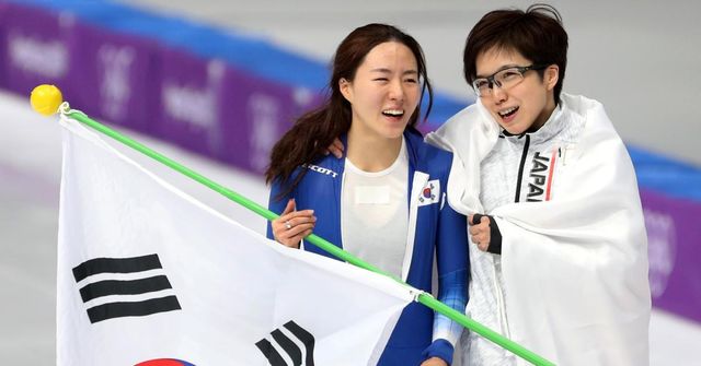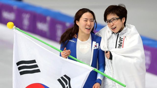강원도 강릉 스피드스케이팅 경기장 오벌에서 열린 2018 평창동계올림픽 스피드 스케이팅 여자 500m 경기를 마친 뒤 일본의 고다이라 나오와 대한민국 이상화가 환하게 웃고 있는 모습. / 뉴스1