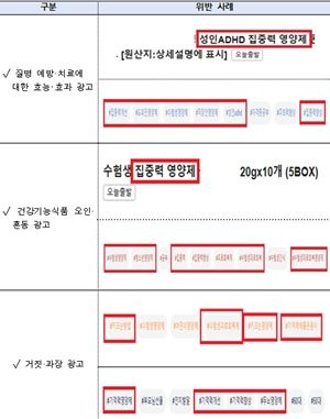 주요 위반 내용은 ▲‘성인ADHD 집중력 영양제’ 등 질병 예방·치료 효능이 있는 것처럼 표현한 광고 3건(6.7%), ▲일반식품을 ‘수험생 영양제’ 등 건강기능식품으로 오인·혼동하게 하는 광고 13건(28.9%), ▲‘기억력 개선(향상)’ 등 인정하지 않은 기능성을 내세운 거짓·과장 광고 29건(64.4%) 등이다.