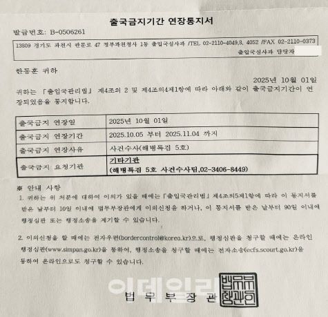 한 전 대표는 전날에도 “이명현 해병특검이 저를 수개월간 출국금지하고 기간도 연장했다”며 법무부로부터 받은 ‘출국금지기간 연장통지서’를 공개했다. 통지서에 따르면 한 전 대표의 출국금지 기간은 10월 5일부터 11월 4일까지 한 달 연장됐다.