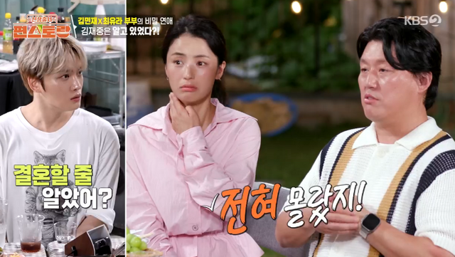 김재중은 “사석에서 한번 만났는데 난 눈치챘다”며 비밀 연애를 포착했다고 말했다. 김재중은 “김민재 형은 형도 모르게 질투를 했다”며 “날 째려볼 이유가 없는데 째려보더라. 사랑을 어떻게 숨기나”라고 증언했다.