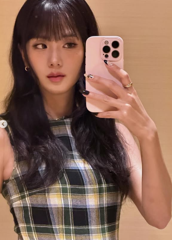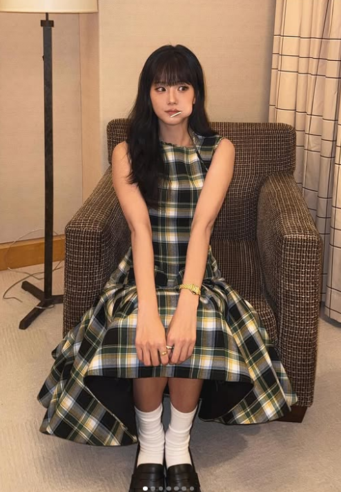 사진 속 지수는 고급스러운 체크 패턴의 드레스를 입고 단정하면서도 세련된 매력을 뽐냈다.