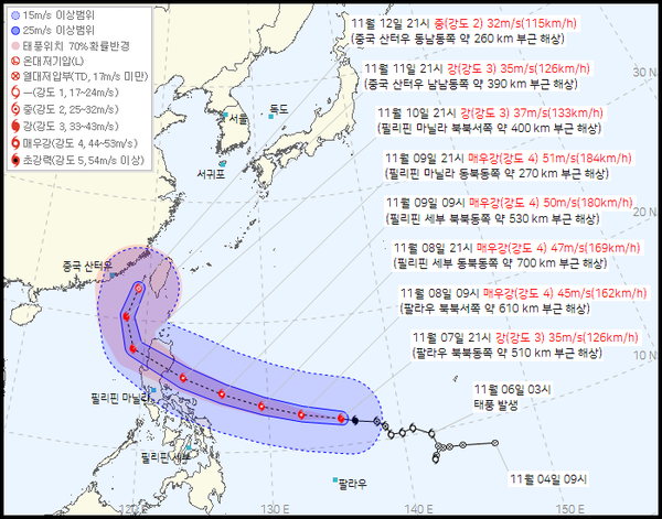 아울러, 오는 10일 필리핀 마닐라 동북동쪽 약 400km 부근 해상을 거쳐 오는 12일 중중 산타우 230km 부근 해상에서 온대저앞부로 세력이 약화될 것으로 보인다.