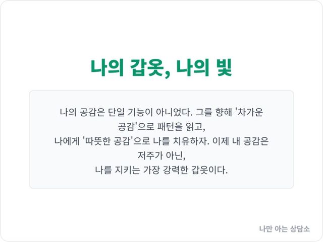 당신의 공감 능력은 저주가 아니었습니다. 그것은 당신이라는 존재의 가장 아름다운 핵심입니다. 그가 그토록 탐내고, 그래서 그토록 파괴하려 했던 바로 그 빛입니다. 이제 그 빛을 되찾아, 어둠을 꿰뚫어 보는 데 쓰고, 당신 자신을 비추는 데 쓰세요. 그것은 당신의 가장 연약한 지점이 아니라, 당신의 가장 위대한 힘입니다.