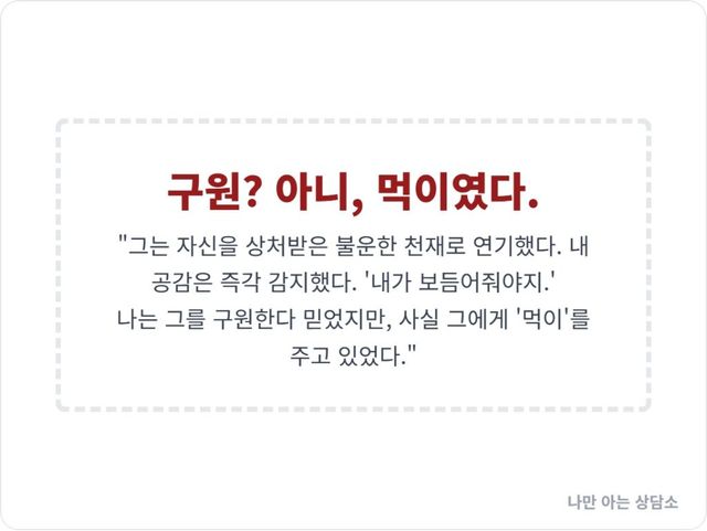 당신은 당신이 그를 ‘구원’하고 있다고 믿었지만, 사실 당신은 그에게 ‘먹이’를 주고 있었던 겁니다.